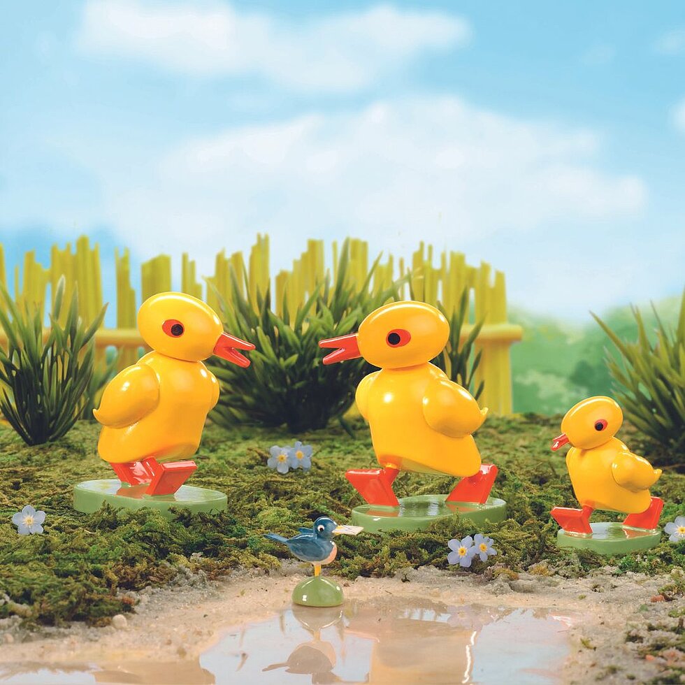Little ducklings tumble jauntily from one adventure to the next. Now it’s time for the next big adventure – school. Mischievous and roguish, they can look either straight ahead or behind them as their heads are movable. With their sunshine yellow plumage, these ducklings make a vibrant addition to a child’s bedroom. A wonderful gift for every little fledgling curiously taking their first big steps in life.